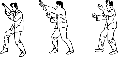 的同时,两掌向前下方作劈打动作,之后,两掌再作 反劈拳动作,至左手在前,掌心斜向前下方,右手 在后,手背斜向前下方。左掌由左向右平削至右肩 前约一尺距离处,右手以崩拳之势向前击出。然后, 左脚向前迈一大步,成左丁八步,两掌置于胸前,作 第二个连环动作,如此反复练习(图217、218、 219 )。