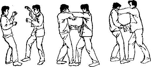对方用右直拳向我头部击来,我两手抬起向左 下方劈挡敌右小臂,同时,右脚提起,向前猛踢对 方小腿迎面骨,在我右脚落地之际,上身右转,两掌 以反劈法进攻,使左掌击对方耳根部位,右掌扣按 对方右臂。然后,我右掌变拳沿对方右小臂绕过,再 以崩拳猛击对方腹部(图223、224、225 ) 0