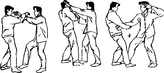 我提右脚用捌尖踢蹈方禧禅,同时,两手由胸 前向上举起,对方后撤闪身,我右脚迅速向前跨步一 一大步,左脚紧跟半步,两手向下劈打对方面部,对 方用两臂架挡。我上身向右旋转,左掌由左向右削 砍对方颈部,右掌变拳由前拉向右下方后,再用崩 拳猛击对方肝肋部位(图220、221、222 ) 0