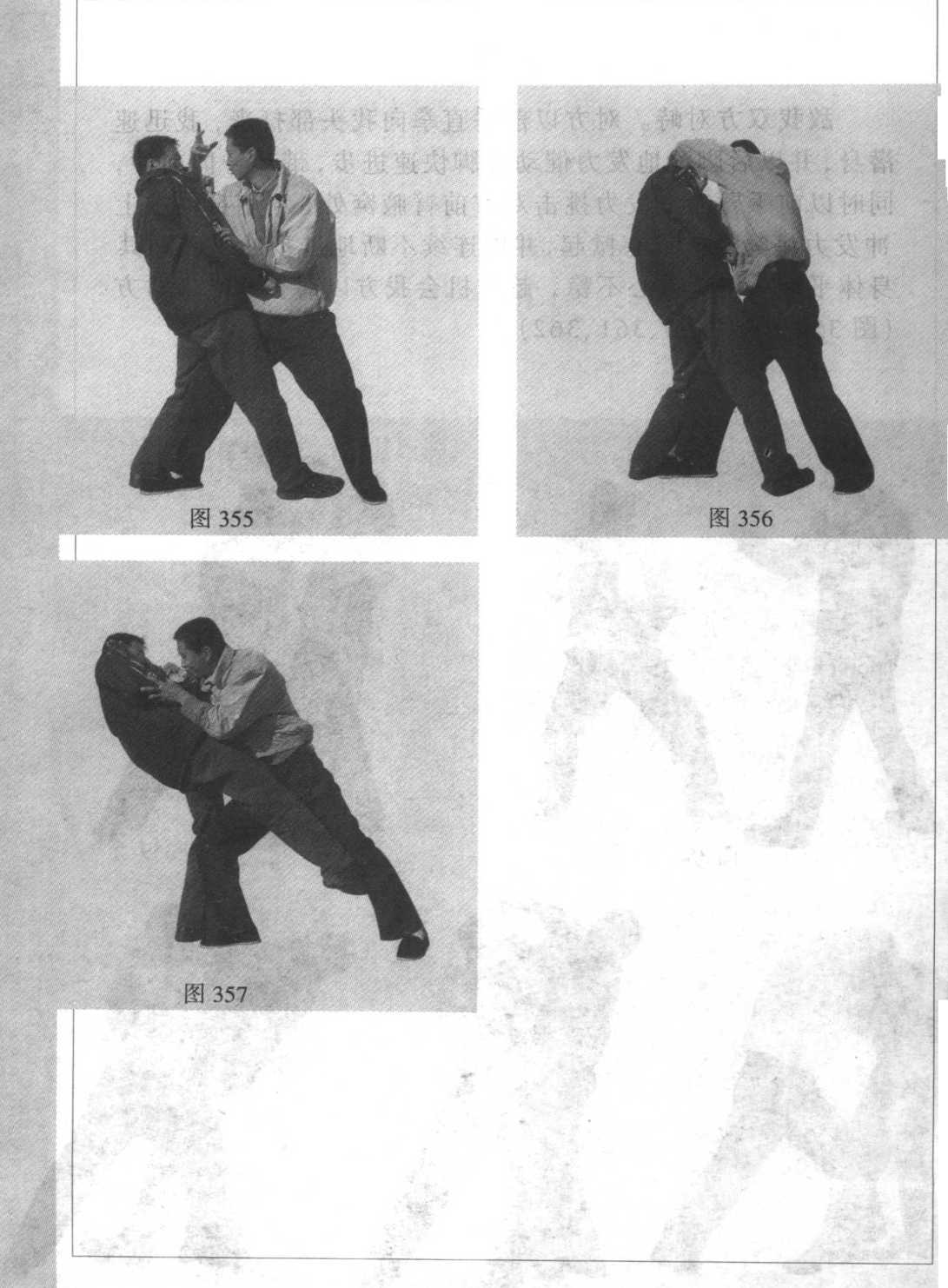敌我双方对峙。我方先发动攻击,以前手向下发力臂砸对方 前手臂,将其间架打散,同时以后脚蹬地发力催动前脚迅速进步, 带动身体前冲。近身后不停,将前腿直插入对方双腿之间,并施以 连续进步冲击,以肩部由下向上发力冲撞其身体,使其身体重心 不稳,失去平衡。趁对方失去平衡,无法站稳之际,我以双手发起 连环攻击(图 353、354、355、356、357)。