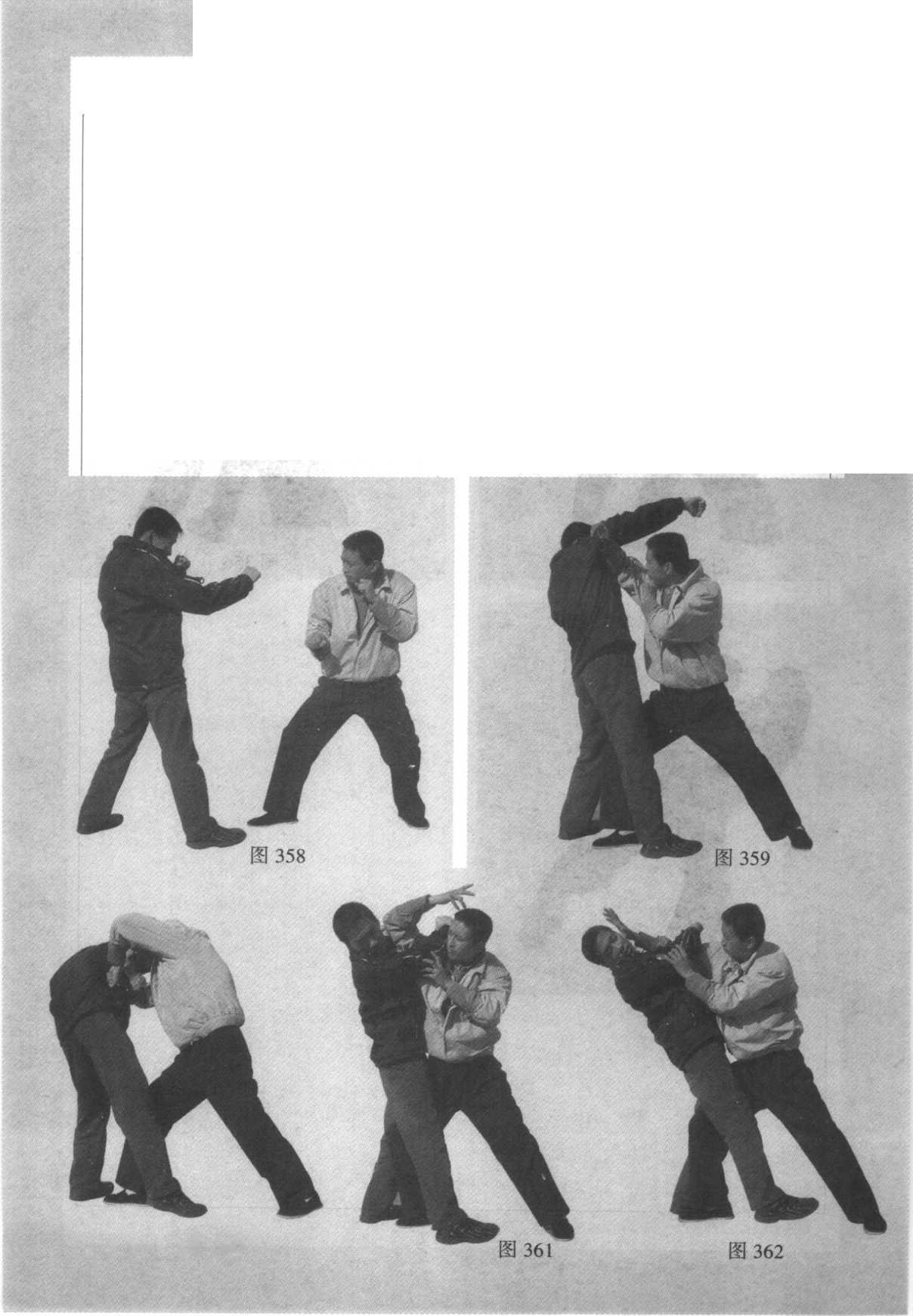 敌我双方对峙。对方以前手直拳向我头部打来,我迅速 潜身,并以后脚蹬地发力催动前脚快速进步,带动身体前冲, 同时以前手臂向上发力挑击对方前臂腋窝处,利用身体的上 冲发力将其身体重心掀起,并以连续不断地进步冲击破坏其 身体平衡,使其重心不稳,趁此机会我方以肘、拳猛击对方 (图 358、359、360、361、362)。