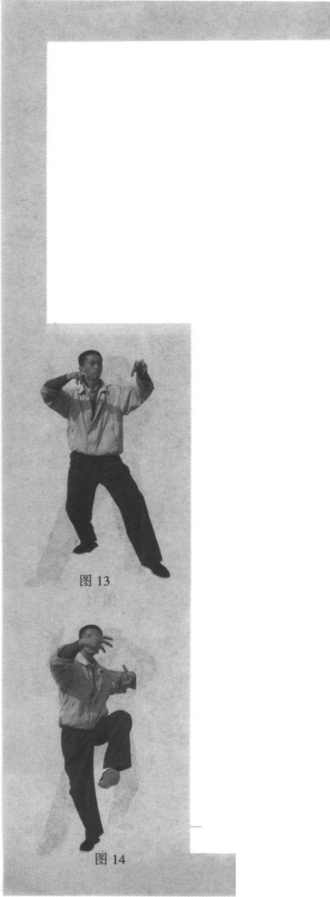 2. 双手上抬环抱于胸前,右手在前,左手在 后。双眼向前平视(图14)o左右互换姿势练习。