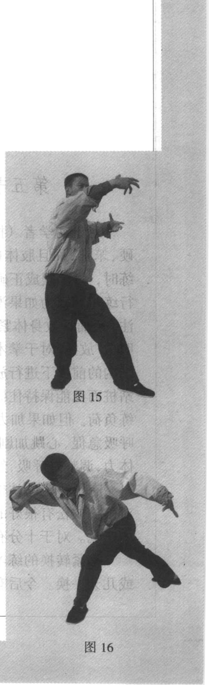 3. 身体前俯,并向左拧转。头部伸直、上挺,并向左拧转, 双眼向左下方注视左手(图16)。左右互换姿势练习。