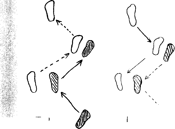 2. 9)9)接着重心移向右脚,左脚经右脚内侧向左前方进步(图6 如此反复练习 【练习要点】