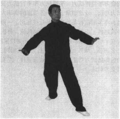 准备势后按浑圆桩式固定体位,但前后脚站 位之间距离较远,为一尺半左右,身位较低;前 手位于左侧大腿外侧与胯同高,手心向下,指尖 指向目注前上方,手腕略向小臂方向上拉,拇指 距左侧胯为一拳左右距离,肘、掌根部弯曲为大 钝角,肘略外撑;后手按于右胯外侧,距胯一拳 左右距离,手心亦向下,指向前上方,要领同左 手臂,但右手位应略低于左手位的高度,左手略 前于右手,头宜上顶,手宜下按;身宜后靠,脚 宜分撑,前膝提顶,后膝内扣,相互之间宜有争 力,方向宜反、宜正、宜分、宜合,尤其以头、 手、足之间的整体配合为主。(图40)