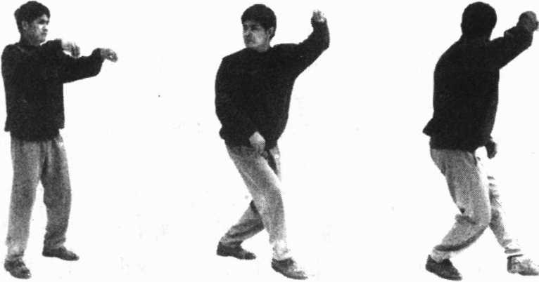 身体重心移至左腿,右脚向前迈步成右丁八步,脚尖着地, 与此同时,头与上身右转,使两眼尽量目视右后方,左手上提至 左肩前约八寸距离,右手下落至右腿上方约四寸距离(图46);