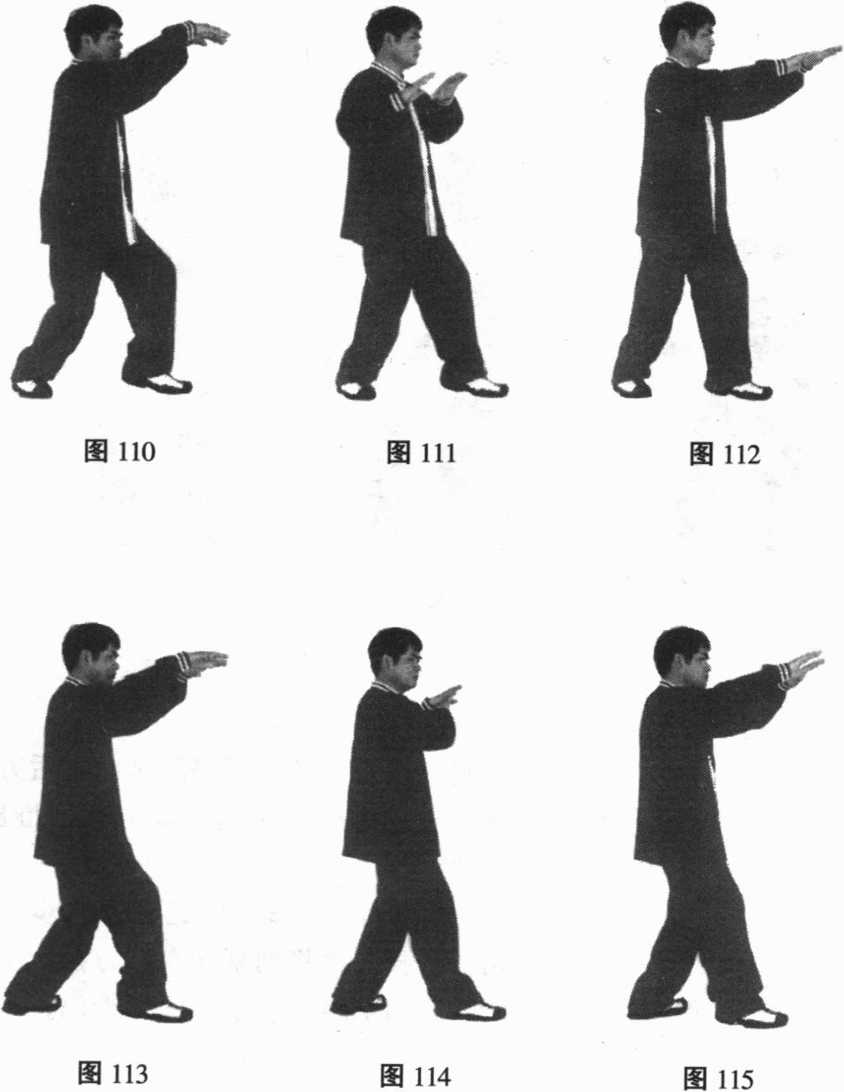 身体重心移至左腿,起右脚向前迈一大步成右丁八步,同 时,两手稍向右平移,并屈膝蹲身,再将两掌向左后方拉,至左 肩前约半尺距离处,然后,两掌向下再向右前方弧形推出,上身 随之直起(图113、114、115)。