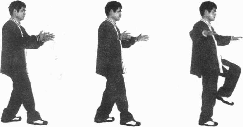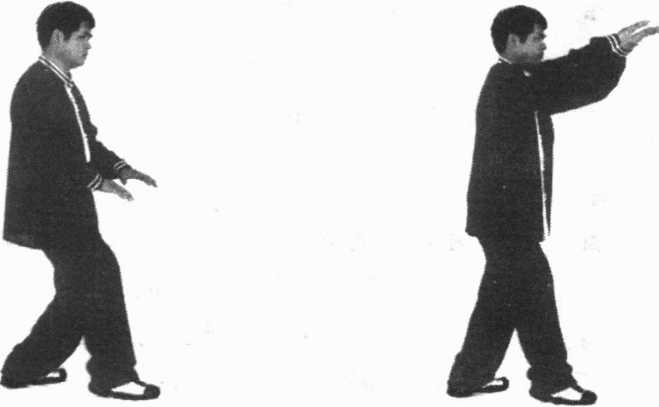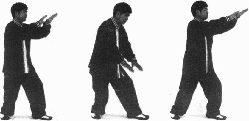 身体重心移至右腿,起左脚向左前方迈步成丁八步,然后, 随着上身的前倾与直起,两臂要做一个类似右式的推波逐浪(图 118、119、120)。在做此动作时,两臂犹如大海巨浪,故此动作 又称为波浪起伏或波浪试力。