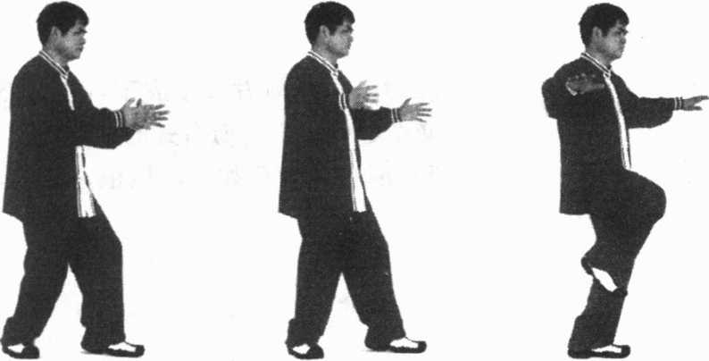 右脚向右前方落地后,两臂边外旋边向内合,使两掌心相对 (图124),当再次外开、内合、拉开时,左膝提起(125、126)。