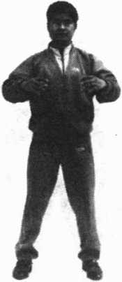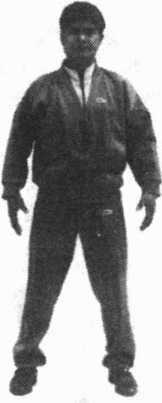 两脚平行而立,左右分开,与肩同宽,两膝自然微屈,两脚 掌平均着力,头直项竖,闾骨正直,臀部后坐,两肩放松,两肘 微屈上提,两臂自然下垂,两手指尖朝下,腋部半虚,不可用 力,要做到虚灵挺拔,舒适均整。(图1)