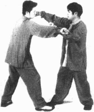 在我与对方对峙的瞬间,突然向对方进攻,先以奔马式的左 右圈锤击打对方头部两侧,然后向前下方扑打对方,最后,再以 两拳或两掌向前上方击打对方(246、247、248)o