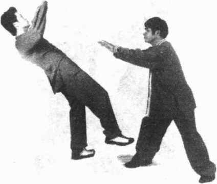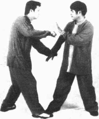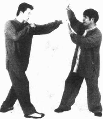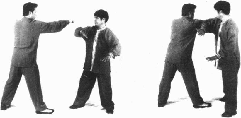 当对方右拳向我击来时,我稍向左闪身,然后,在向右转身 的同时,以右旋掌之势击打对方(255、256、257)o
