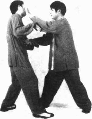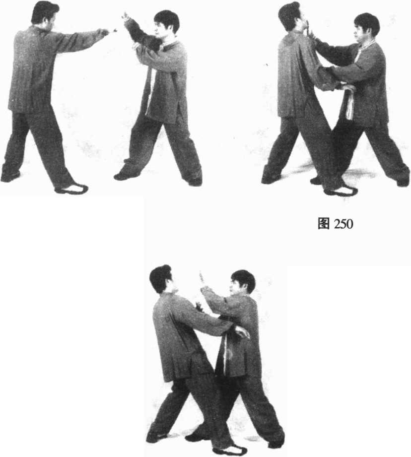 劈打对方面部,然后再以反劈动作劈打对方面部或胸部(249、