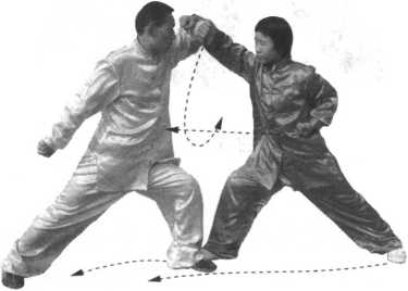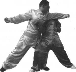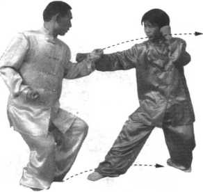 (2)接着,甲左脚前上一步,成为左弓步, 同时用左冲拳向乙胸部击打;乙身体重心后移, 里收左脚成为丁步,同时用左掌外拨开甲来拳。 (图 4一8 )