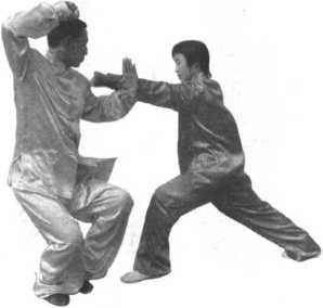 (1)当甲前上右脚一步,成为右弓步,同时用 右拳向乙面部击打而来;乙左脚前上步成为左弓 步,同时,用左臂向上架开甲来拳。(图4-7)