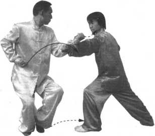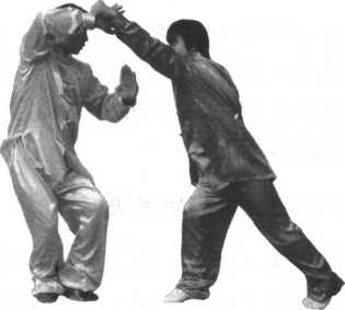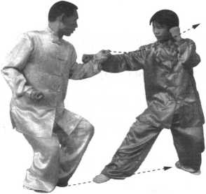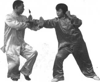 (1) 当甲前上右脚一步,成为右弓步,同时用 右冲拳向乙胸部击打时;乙左脚里收成为左丁步, 同时用右掌外格拨甲来拳之腕部,用左掌挑拦甲右 臂,防开甲右拳。(图4-21)