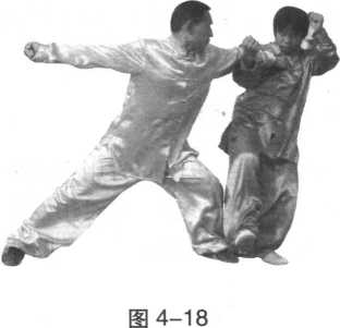 (2)乙左脚前上一步,成为左弓步,同时左拳 向甲胸部击打,使甲后侧倒地。(图4-18)