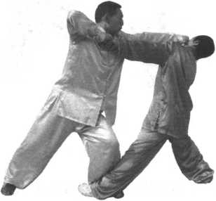 (1)当甲前上左脚一步成为左弓步,同时用左 直拳向乙胸部击打时;乙左脚里收成为左丁步,同 时用右手前臂向右前下方横向格压,防开甲左拳。 (图 4-19)