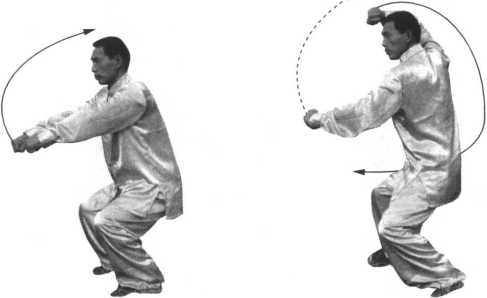 (2) 步型不变,右臂向上、向后划孤,抡 摆,右拳拳眼向下,拳面向前,目视正前方。 (图 3-4 )