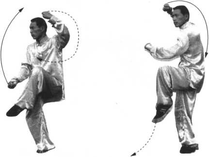 (3) 上动不停,右腿支撑身体,左腿屈膝上