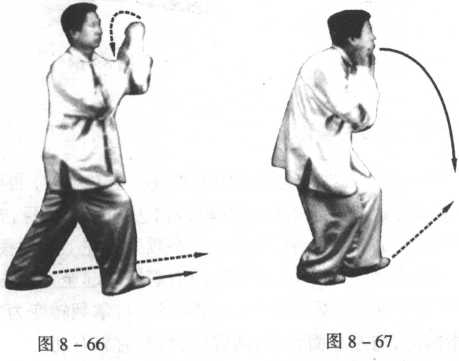 动作不停,重心移在右脚,右 腿屈膝下蹲束身;左脚跟进至右 脚前,成为右单重步;同时,右掌 变为拳,拳心向前,拳面向上,与 嘴相平;左拳随左臂内旋翻转变 为掌,掌心向右护在右拳眼处;两 臂屈肘,两肘分别靠在两肋;头微 抬,两眼平视前方(图8-65、图 8-66、图 8-67)。