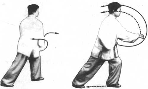 1 .接上式,右脚随上体左转束身收回至左脚前,再随上体 右转向右前方迈进一步落地;左脚后蹬,左腿绷直展身,成为右 三角步;同时,右拳变为掌,右掌护左拳顺弧向左上起领拨,再随 上体右转展身和左臂外旋,经下腹向右翻转上起至上体右前方, 左拳变为拳心向左,拳面向上,与嘴相平;右掌翻转变为掌心向 前,掌指向上,与左拳面相平;两臂屈肘,右肘靠右肋。