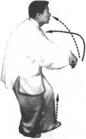 对方用左拳由下向上打我胸腹及下颌,我随向右转体束身, 顺势上起横裹彼臂,然后再随进步展身,用右拳、右膀击打彼胸 腹。