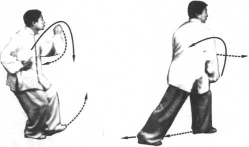 上体左右转时,要以腰为轴扭转。展身时,膀是由上往下 落。展身后,膀尖、膝尖与脚尖要上下对齐。