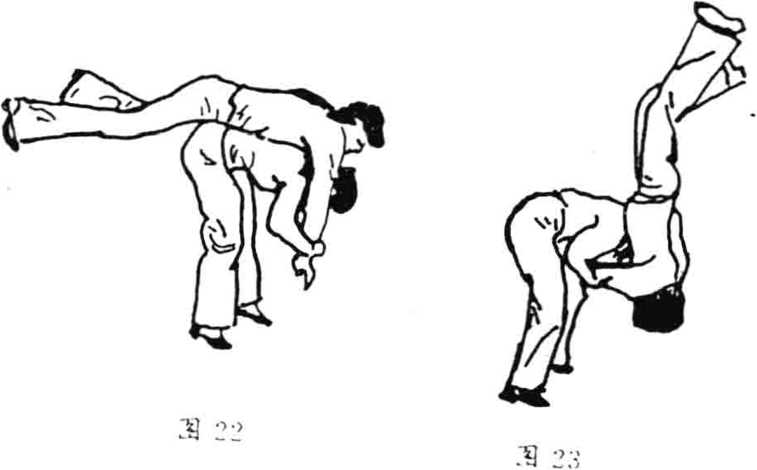 男从女身后拥抱女(图20),女两腿微屈,两臂平 屈,两手抓握男两手(图21),上体前屈(图22),两手用力下拉 男双手(图23)O