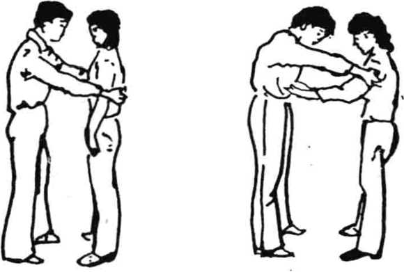 7. 插指头打膝顶:男从女身体正面拥抱女(图24),女用 手指插男两肋(图25),用头部前额击打男鼻子(图26),再用 右膝顶撞男生殖器(图27)。