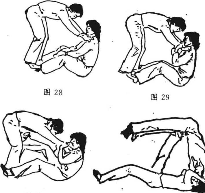 8. 坐卧蹬腿:女坐,男两手抓女两肩(图28),女两手抓握 男两手腕(图29),身体后仰,举右腿(图30),仰卧并以右腿向 上猛蹬男腹部(图31)o