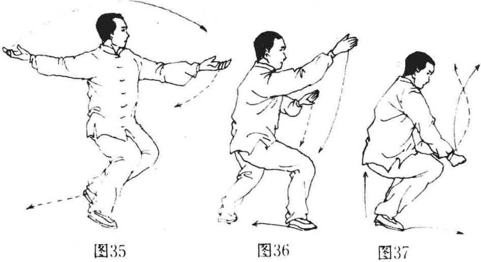 拳术动作接上式,身微向右扭转,左掌顺式通臂向前伸, 掌心翻转向上。同时,左脚向前进半步落于右脚跟边,脚尖点 地。右掌由右下向后伸臂,翻转掌心向上。(图35)向上划弧, 由上向前伸暨扣掌.左掌向里翻转掌心向下。同时,左脚向后 斜退半步。(图36)两掌由上向下五指合拢蛹动握拳向下采 冽,身向下屈膝坐腰下蹲。右脚随之向后退半步靠进左脚跟,