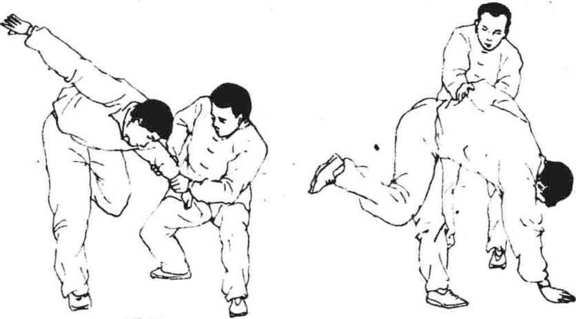 左臂前伸上抬接迎击来的臂腕,我顺式向左拨采住敌腕,右掌 及时抓住敌方击来的上臂,借来势之力我退步转身由上向左 斜下方采例以破其攻击。(用法见图38.39)