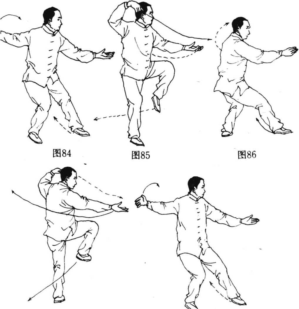 拳术动作接上式.左脚下落,左掌翻转掌心向上,臂向前 伸。右掌从右下向后翻转向右上,掌心向上。(图84)右臂屈肘 翻转掌心向下由额头右侧向前推出。同时,左腿轻轻提起在右 腿前向内旋踝转腿划弧.(图85)然后,向后偏左、倒退一步. 全脚慢慢落实,身体重心移到左腿,身向后坐。右掌由头后翻 转掌心向下继续向前推出,掌心向前。左臂屈肘左掌后撤掌心 向上,撤至左肋外侧,(图86)左掌继续向后上方划弧平举,翻 转掌心向前屈肘由耳后向前推出,掌心向前。右臂屈肘后撤, 掌心向上撤至右额外侧。同时,右腿轻轻提起在左腿前旋踝转 腿划弧,然后再向后偏右倒退一步,全脚慢慢落实,身体重心 移到右腿,身向后坐。(图87,88)右臂屈肘右掌由头后翻转掌 心向下向前推出掌心向前。左臂屈肘左掌后撤掌心向上撤至 左肋外侧。同时,左腿轻轻提起在右腿前旋踝转腿划孤,然后 向后偏左倒退一步.全脚慢慢落实,身体重心移到左腿,身向 后坐(图89、90)。左掌继续向后上方划弧平举,翻转掌心向前 屈肘由耳后向前推出,掌心向前。右臂屈肘后撤,掌心向上撤 至右额头外侧平举。同时,右腿轻轻提起在左腿前旋踝转腿划