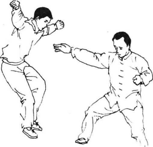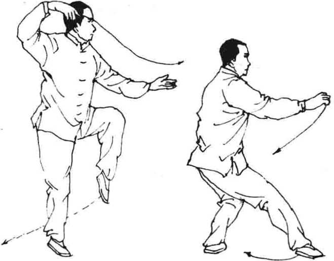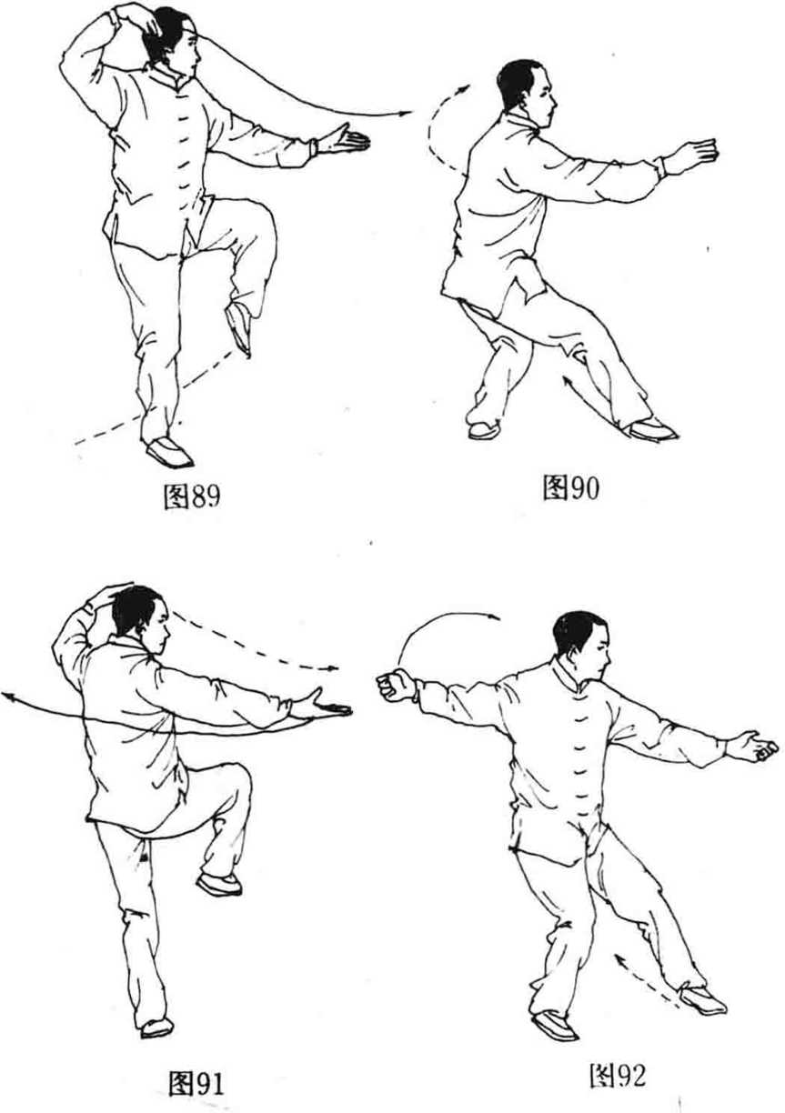 肋外侧。同时,左腿轻轻提起在右腿前旋踝转腿划弧,然后向 后偏左倒退一步,全脚慢慢落实,身体重心移到左腿.身向后 坐(图 93、94)。