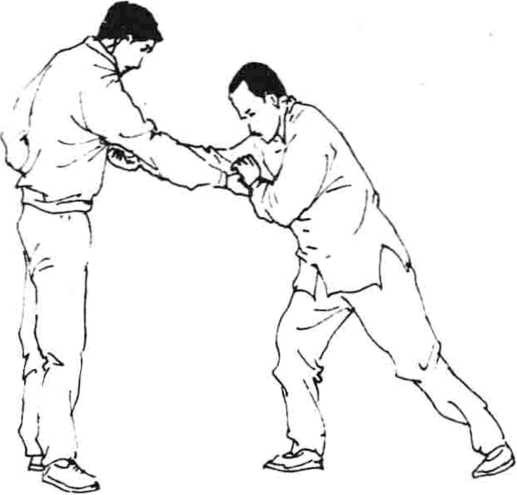 阳经脉的气息往复平衡,增进人体身腿的灵活性。加强头脑的 敏感性.对防治脑神经疾病,眩晕有治疗之效。拳术外用为退 法,是一种逃脱敌方拿住手腕,以翻转被拿臂腕用缠丝劲破解 其拿法,同时以另一掌推插其对方肘“曲池穴”以解脱。(用法 见图95.96)