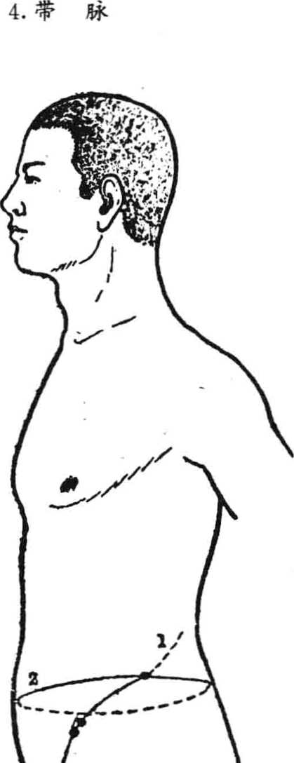 带脉,总束诸脉,回绕一身如束带状。起于季胁下边,斜向 下行,交会于足少阳胆经的带脉,横行绕身一周,又斜向前下 方与玉枢、维道二穴相连。(图192带脉循行部位图)。