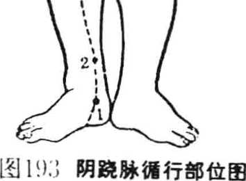 阴跷脉禀足少阴肾经之脉气而别出,故云少阴之别。其脉 下起于足跟然谷穴,上至目内眦与手太阳小肠经、足太阳膀胱 经、足阳明胃经、阳跷脉交会。(图193阴跷脉循行部位图)。