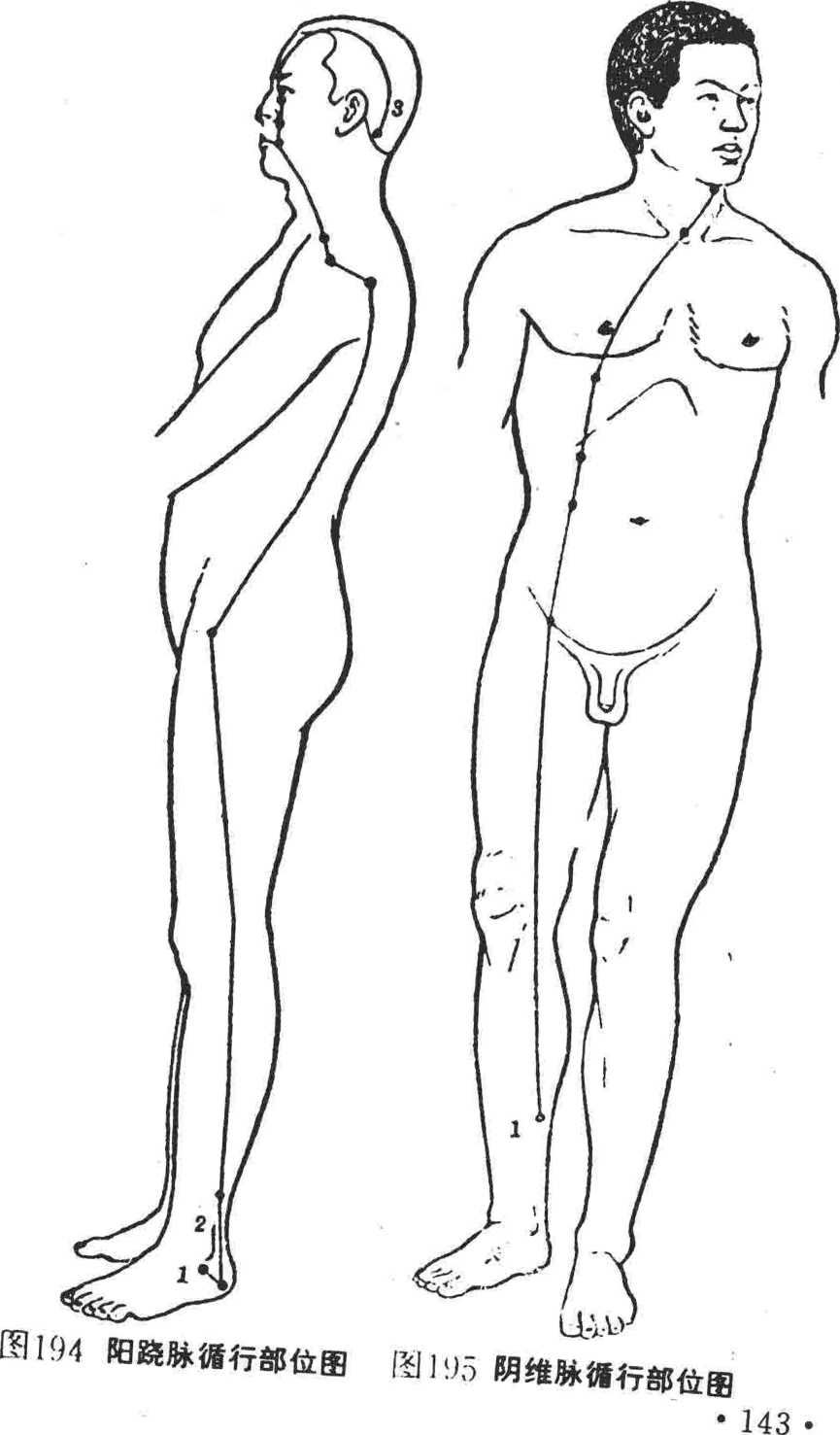 阳跷脉禀足太阳膀胱之脉气而别出于胆经、小肠经、大肠 经、胃经等经络内部分穴位交会,故阳跷为太阳之别。(图194 阳跷脉循行部位图)。