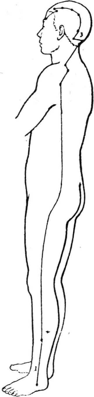 阳维脉起于外踝下金门穴与足少阳胆经并行,经躯干部 后外侧,从腋后上肩,经颈部,两颤骨颊部到前额,再由前额经 头顶折回与督脉会合,谓“阳维起于诸阳会也”。(图196阳维