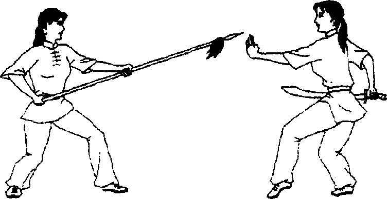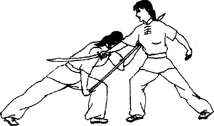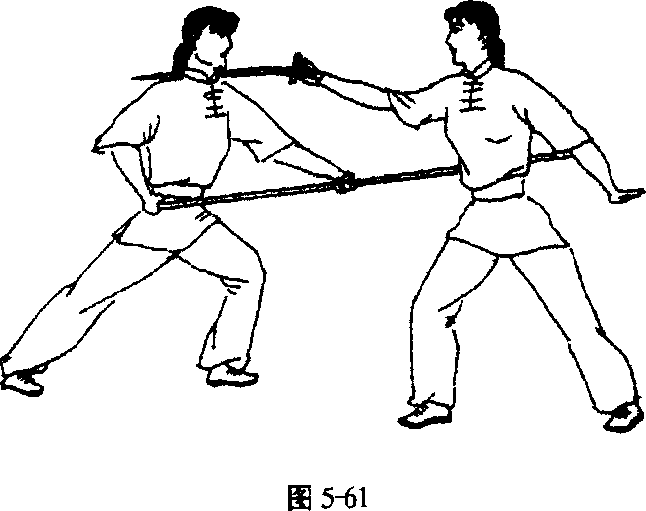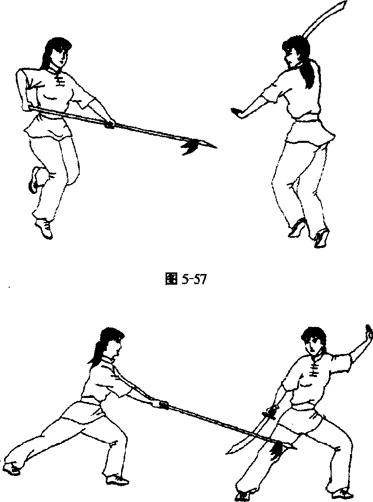 乙方左脚蹬地跳起,右、左脚依次向前落地,成左弓步,进 下扎枪扎击甲方腿部。甲方左脚蹬地跳起向左转体一周,右、 左脚依次落地成左侧弓步,右手刀向下、向右、向上、向下抡劈 乙枪。(图5-57、图5-58)(十)刀术攻防练习之十1. 上扎枪挂刀由乙方半马步抱枪,甲方虚步藏刀开始(图5-59)o乙方 进上扎枪扎击甲方眼睛。甲方撤左脚成右虚步,右手刀以刀 背为力点向上挂挡乙枪。(图5-60)图 5-59图5702. 抹刀下闪甲方进右步成右弓步,右手刀向前、向左抹击乙方颈部 (图571)。乙方左腿下蹲,上体前屈,低头闪过。(图5&)