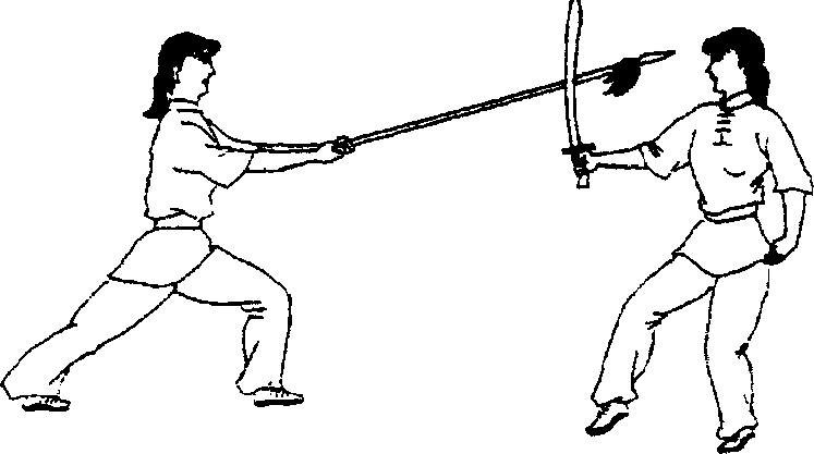乙方抬头起身,抽枪顺势进上扎枪扎击甲方面部。甲方 右腿后撤一步成右虚步,右手刀向上挂挡乙枪。(图5~63)图573
