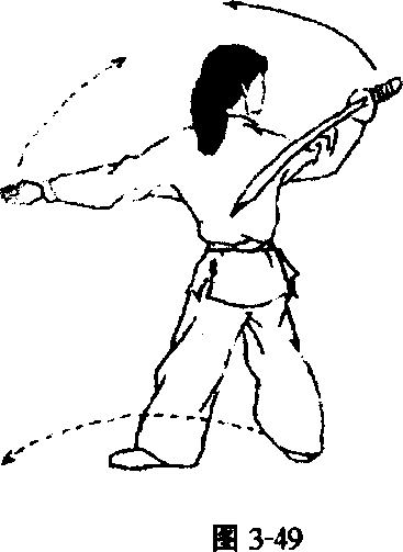 右手持刀屈肘外旋,使刀背从右肩外侧向后绕行,刀尖斜 向下。目视右侧。(图3-49)