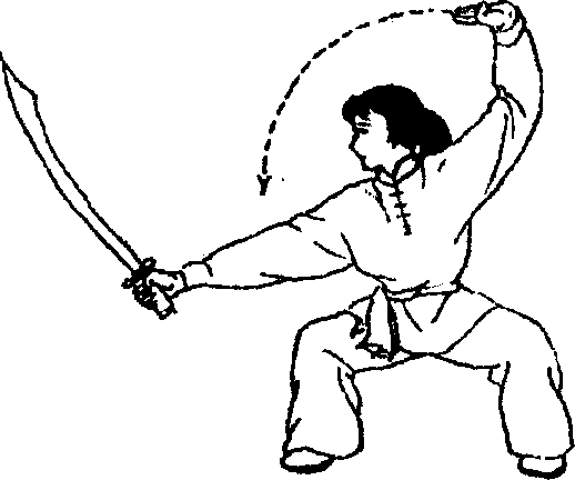 身体边起立边向右后转。右手持刀与左掌随身体转至上 身左侧时向上举起,刀尖斜朝下。目视刀尖。(图3-52)