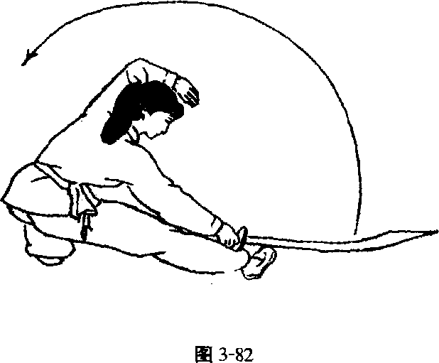 上动不停。上体继续后转,左脚向身后落步成仆步。右 手持刀在转身落步的同时向上、向前劈下;左掌向下、向后上 方摆起成横掌,肘微屈。目视刀尖。(图3-82)