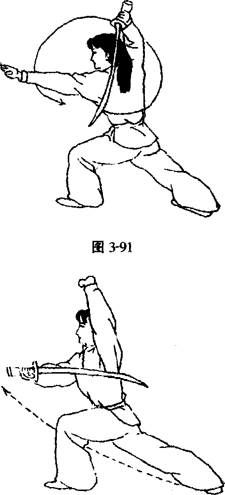 左脚向左斜前方落步, 膝微屈,右手持刀从左肩外 侧向后沿肩背绕行;左手向 左平摆,掌心朝下。(图3- 91)