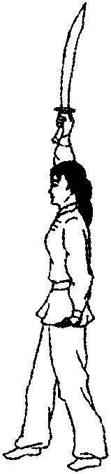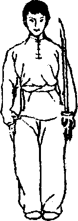 直立,两脚并拢。左手在左胯侧抱刀。刀直立,刃向前, 刀尖向上,刀背贴靠前臂内侧,拇指在前,其余四指在后握住 刀盘。右手自然下垂于体右侧。目视前方。(图2-1)