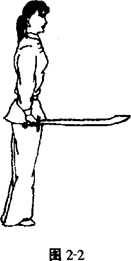 直立,两脚并拢。右手在右胯侧握刀,虎口贴靠护手盘, 大拇指与其余四指分握于刀柄两侧,刀刃向下,刀尖向前。左 手自然下垂于体左侧。目视前方。(图2-2)