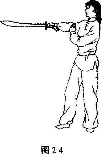 脚分前后站立。右手握刀上举,刀刃向前,刀尖向上。左 手按于左胯侧。刀由上而下用力,力达刀刃前部或中部。同 时左臂屈肘上摆配合用力。目视前方。(图2-3、图2-4)