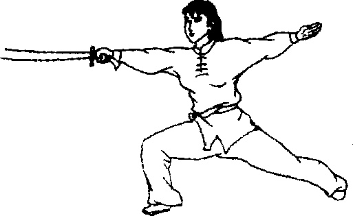 右手握刀向前或前上或前下直出直刺,刀尖、臂与刀成一 直线,力达刀尖。如弓步扎刀(图2-5)。